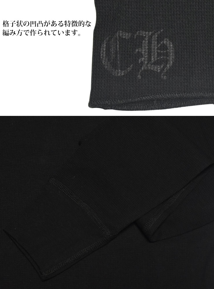 ワッフル素材とは生地表面に格子状の凹凸がある特徴的な編み方をした生地でその凹凸に空気を含み蒸れにくく、伸縮性があるため、着心地が抜群にいい素材です。クロムハーツのワッフルは1つ1つの凹凸がかなり細かく、ワッフル特有の立体感がデザイン性をあげています。伸縮性があるため、体にフィット感があり、スタイリッシュに着こなせるロングTシャツです。背面、左胸には、クロムハーツのアパレルアイテムの中でも人気が高いへアリーダガーがプリントされており、クロムハーツらしく着れるアイテムです。