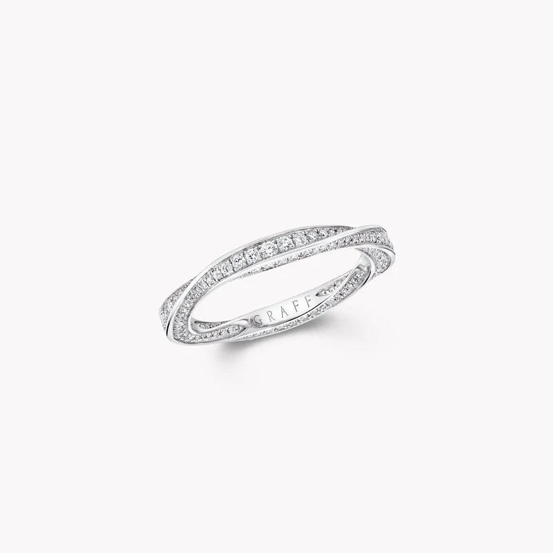 エレガントにツイストされたダイヤモンドが創り出す2.2㎜のラインが指の周りを彩るホワイトゴールドのスパイラルバンドは、繊細でありながらダイナミックなデザインで永遠の愛情をシンボリックに表現しています。ザ グラフ スパイラル コレクションは繊細なゴールドとパヴェダイヤモンドの溢れる輝きでクラシックモダンを表現しており、同コレクションのジュエリーやタイムピースとマッチさせてもお楽しみ頂けます。