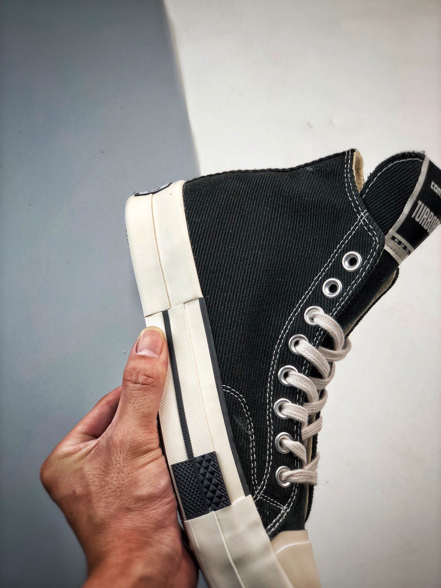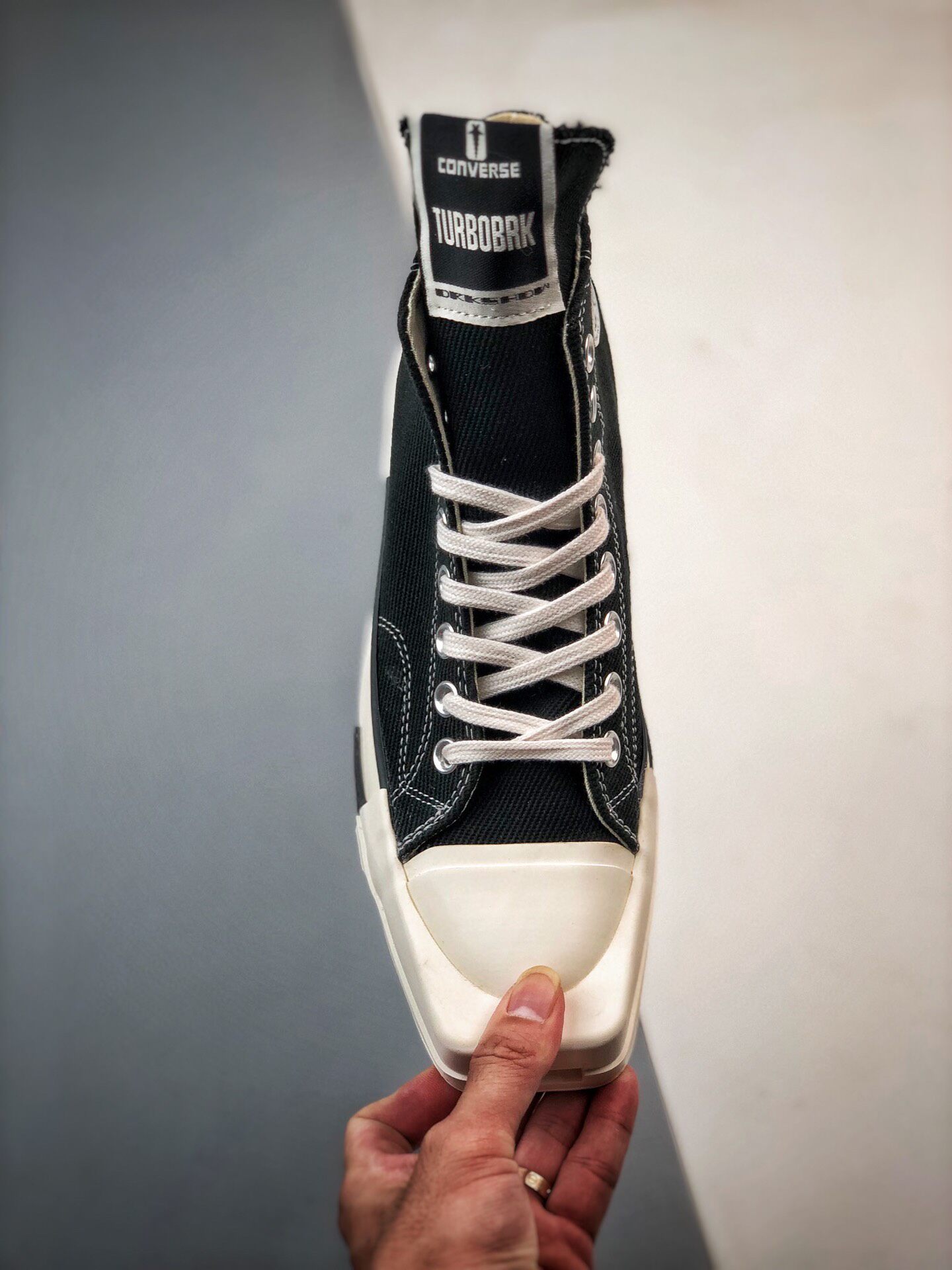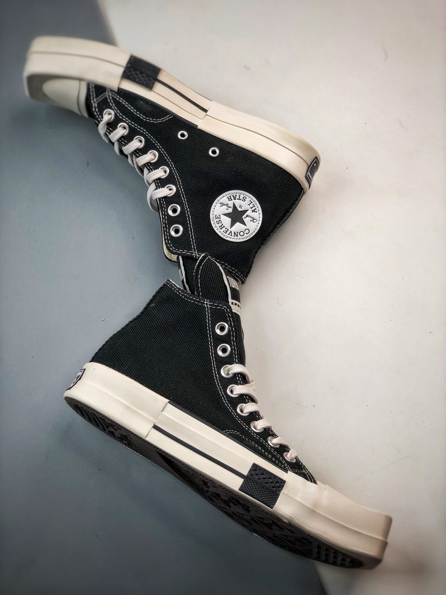 新たにディフュージョンライン"RICK OWENS DRKSHDW(リック・オウエンス・ダークシャドウ)"と、"CONVERSE(コンバース)"との至高のチームアップが実現。リック自身が「コンバースと言えば、白黒の"CHUCK TAYLOR ALL STAR(チャックテイラー オールスター)"とパンクロック」と語る不朽の名作から、"TURBODRK CHUCK 70( ターボダーク チャック 70)"を生み出した。ロックンロールの王道のブラック&ホワイトを基調に、大胆不敵なラバースクエアトゥへとアレンジ。長めに設定したシュータンは、リックオウエンスのアイコンスニーカー、"GEO BASKET"を彷彿させる。「どこにでもあるモノを見ると、それを歪めたい」するリックの感性やポリシーを反映、世界中のファンが狂喜の逸足として激しい争奪戦が予想される。