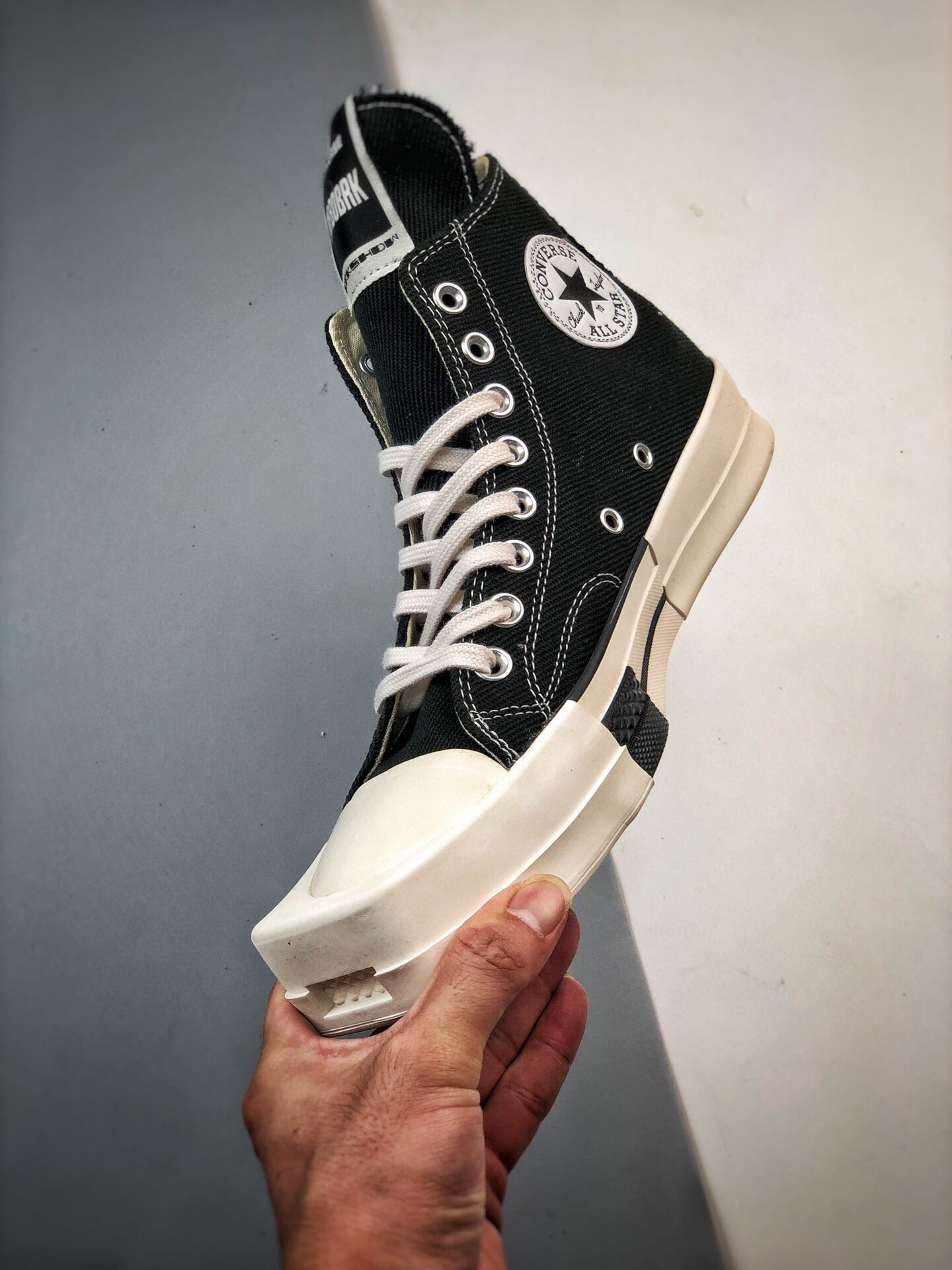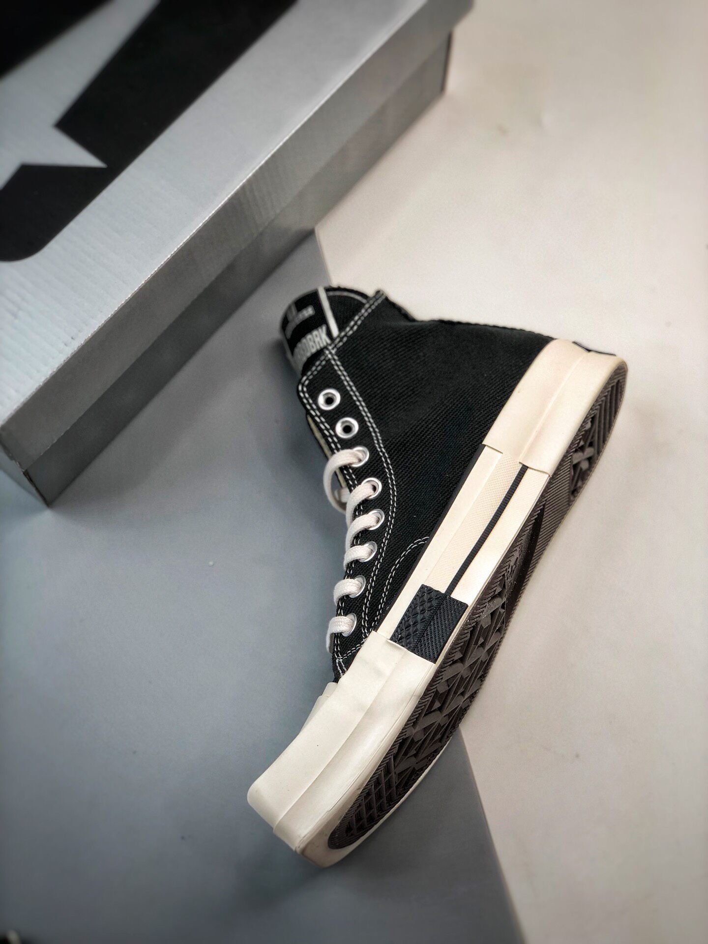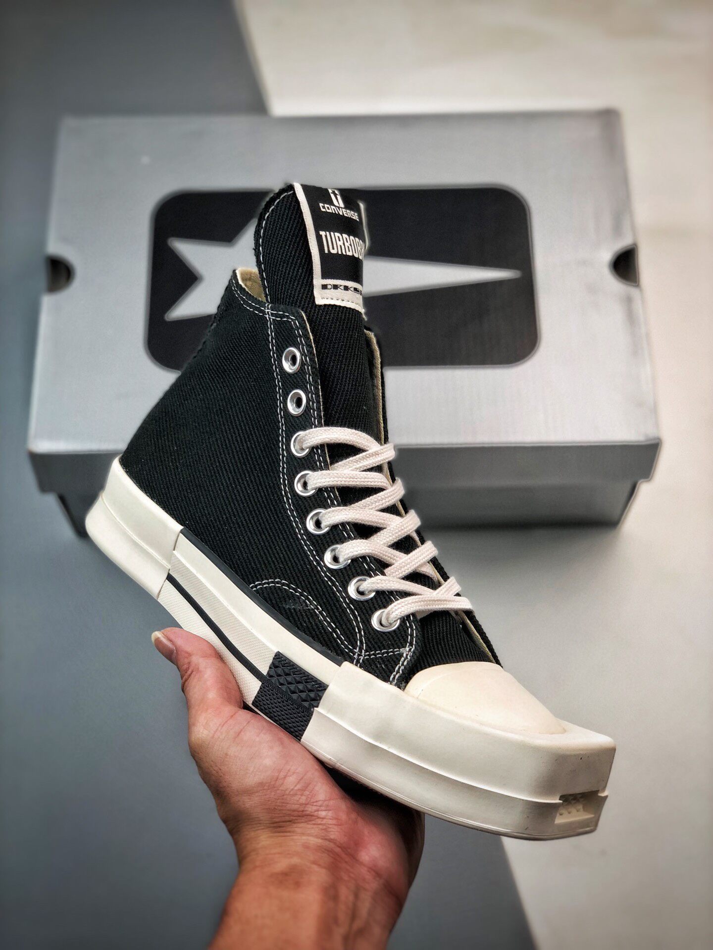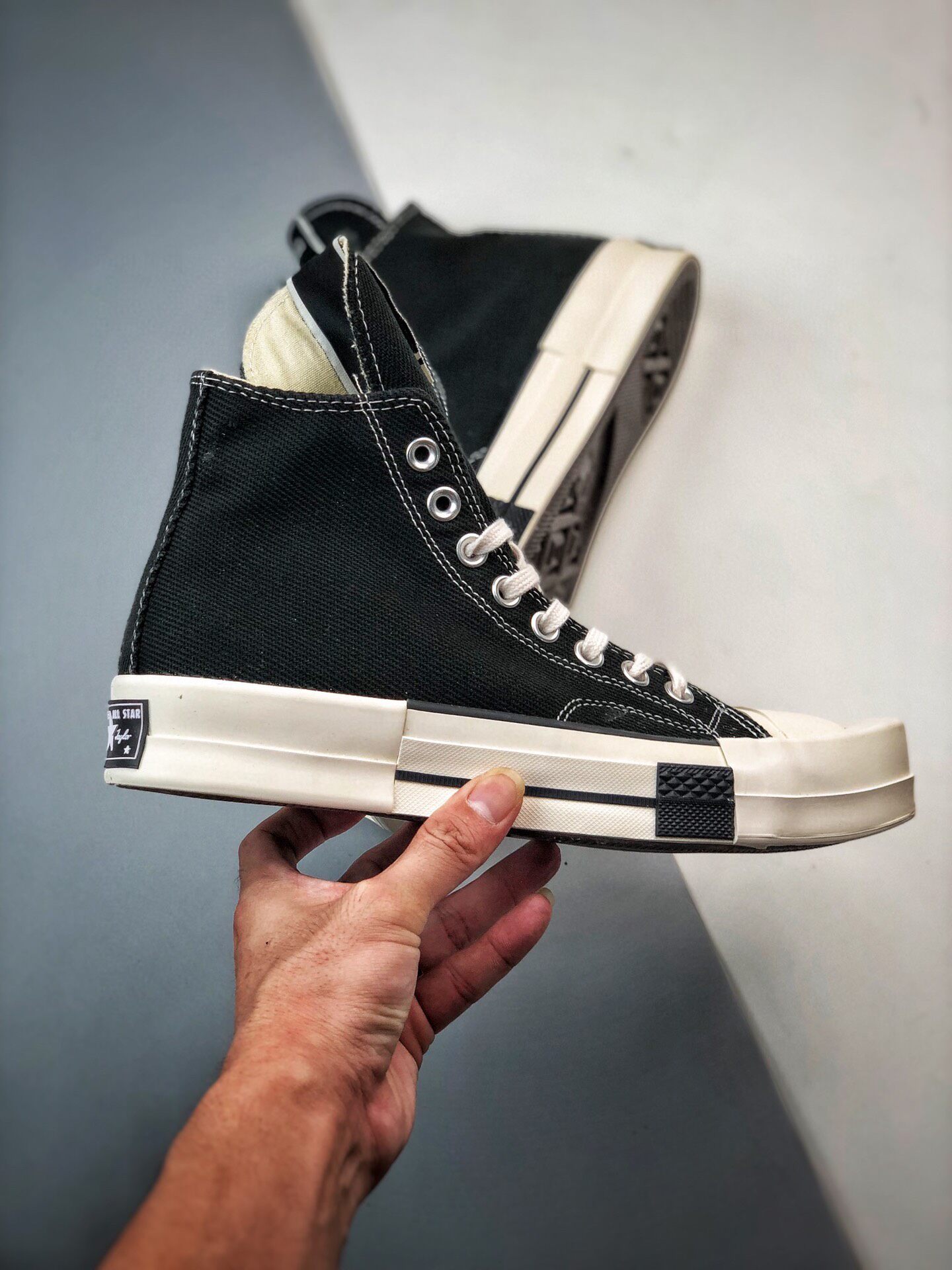新たにディフュージョンライン"RICK OWENS DRKSHDW(リック・オウエンス・ダークシャドウ)"と、"CONVERSE(コンバース)"との至高のチームアップが実現。リック自身が「コンバースと言えば、白黒の"CHUCK TAYLOR ALL STAR(チャックテイラー オールスター)"とパンクロック」と語る不朽の名作から、"TURBODRK CHUCK 70( ターボダーク チャック 70)"を生み出した。ロックンロールの王道のブラック&ホワイトを基調に、大胆不敵なラバースクエアトゥへとアレンジ。長めに設定したシュータンは、リックオウエンスのアイコンスニーカー、"GEO BASKET"を彷彿させる。「どこにでもあるモノを見ると、それを歪めたい」するリックの感性やポリシーを反映、世界中のファンが狂喜の逸足として激しい争奪戦が予想される。